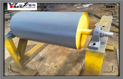 2、根據永磁磁力滾筒磁系包角的不同,可以分為永磁磁滑輪及永磁磁滾筒。磁滑輪的磁包角為360;,磁極組均勻分布在筒內圓周,組成滿圓型磁系,磁系和筒體一起隨皮帶同速轉動,工作平穩,安全可靠。由于其卸礦原理是通過皮帶拖曳力實現的,一般用于磁場強度為180mT以下的永磁磁力滾筒,以減小對皮帶損傷。